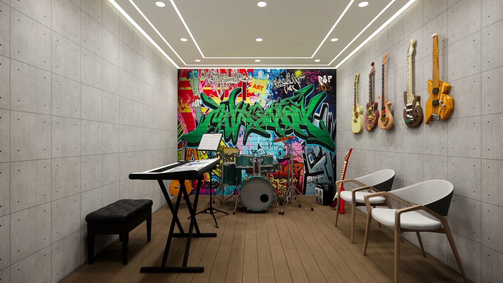 Our co-working studio will have state-of-the-art shared facilities, including a Mac computer lab, a soundproof music room, a film/photography studio, an open studio area for painters, and a meditation room.